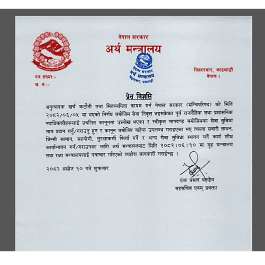 अर्थ मन्त्रालयले शुक्रबार पठाएको पत्राचारमा मन्त्रिपरिषद्को निर्णयलाई शीघ्र कार्यान्वयन गर्न गृह र रक्षा मन्त्रालयलाई आग्रह गरिएको छ ।
