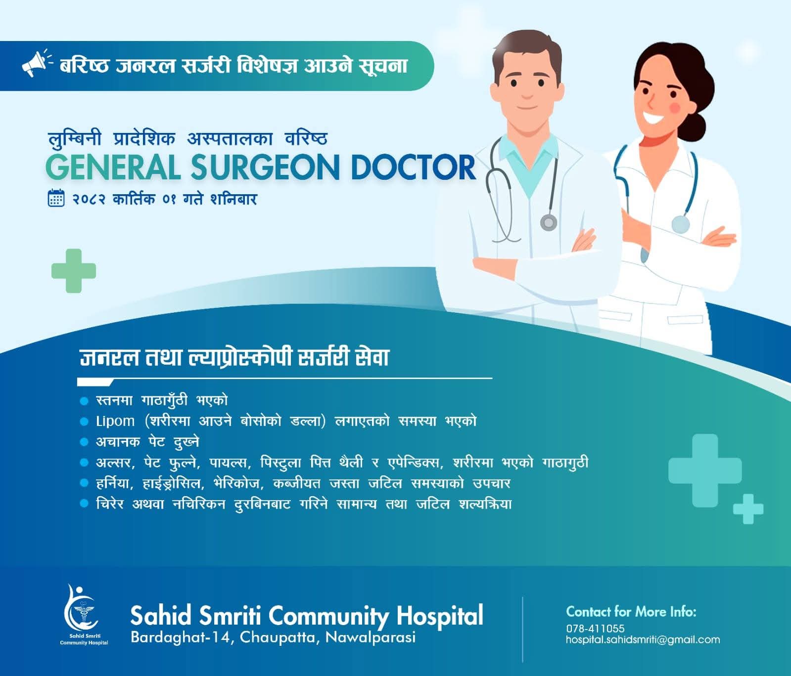 नवलपरासी । बर्दघाट नगरपालिका वडा नम्बर १४ चौपत्तामा रहेको सहिद स्मृति सामुदायिक अस्पतालले सेवा विस्तार गर्दै अब सर्जरी (अपरेसन) सम्बन्धी उपचार सेवा सञ्चालनमा ल्याउने भएको छ । लुम्बिनी प्रादेशिक अस्पतालका अनुभवी सर्जन डाक्टरको उपस्थितिमा विभिन्न प्रकारका शल्यक्रिया तथा रोगहरूको उपचार सेवा यस अस्पतालमा उपलब्ध हुने भएको हो ।